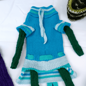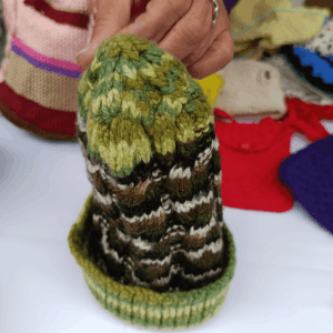 Gorros, vestidos para mascotas, bambas y gran variedad de objetos en diversos colores y técnicas de tejido.