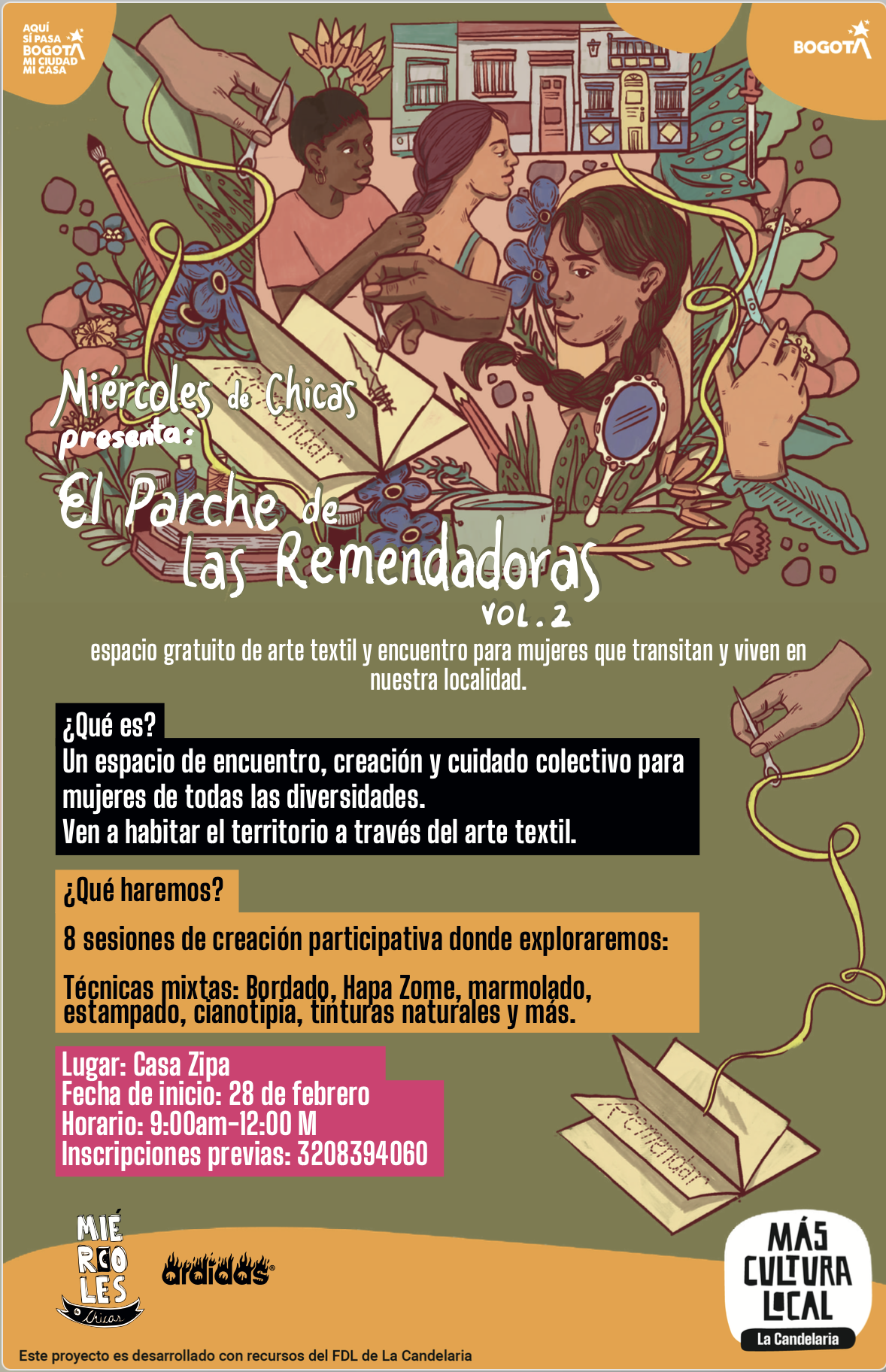 Se realizará un costurero temporal de creación participativa, estructurado en ocho sesiones, en las que las participantes aprenderán y aplicarán diversas técnicas y expresiones artísticas con base textil, como bordado, bordado de aplique, técnica hapa zome, marmolado textil, estampado, tintura natural de hilos y telas, y cianotipia, promoviendo la experimentación y el aprendizaje colectivo.