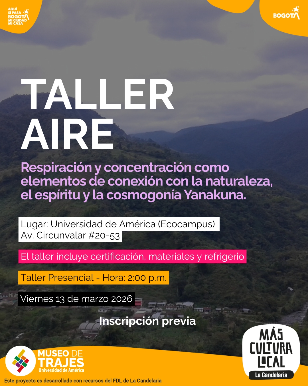 En el taller Aire se profundizará en las mitologías y relatos de animales vinculados a este elemento, articulando la sabiduría ancestral Yanakuna, los procesos museológicos y pedagógicos del Museo de Trajes.